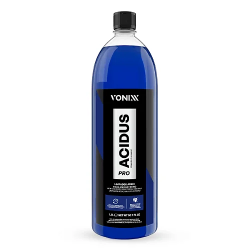 Produto ultra concentrado para remover sujidades ACIDUS PRO é um limpador ácido automotivo de alta performance, desenvolvido para remover sujeiras minerais em rodas, chassis, emblemas, plásticos externos e metais. Sua fórmula balanceada permite restaurar a originalidade de diversas áreas do veículo, eliminando marcas d'água leves em vidros e pinturas, além de poder ser utilizado na limpeza de motores e detalhes de difícil acesso, grades e contornos. DILUIÇÃO Remoção de oxidação: Puro | Sujeira pesada: 1:5 | Sujeira média: 1:10 | Sujeira leve: 1:30. INDICAÇÃO DE USO Rodas com incrustações minerais. | Marcas d’água leves em vidros e pintura. | Plásticos externos, frisos e emblemas. | Partes cromadas e metálicas. | Chassis. | Superfícies do compartimento do motor. | Multi-limpador ácido de uso geral.